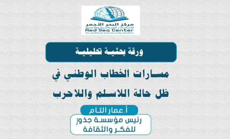 وبين ايدينا الورقة البحثية للباحث الاستاذ عمار التام التي صدرت عن مركز البحر الاحمر للدراسات السياسية والامنية التي حاول من خلالها الباحث التام التركيز على جانب مهم من جوانب المواجهة تلخصت حول مسارات الخطاب الوطني في ظل حالة اللا سلم واللاحرب.